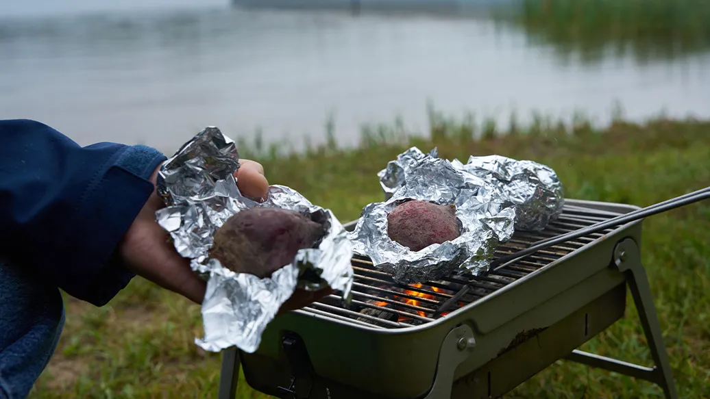 Randen waschen, in Alufolie wickeln und 45–50 Minuten auf dem Grill oder im Backofen bei 180–200 °C garen, bis sie weich sind.
