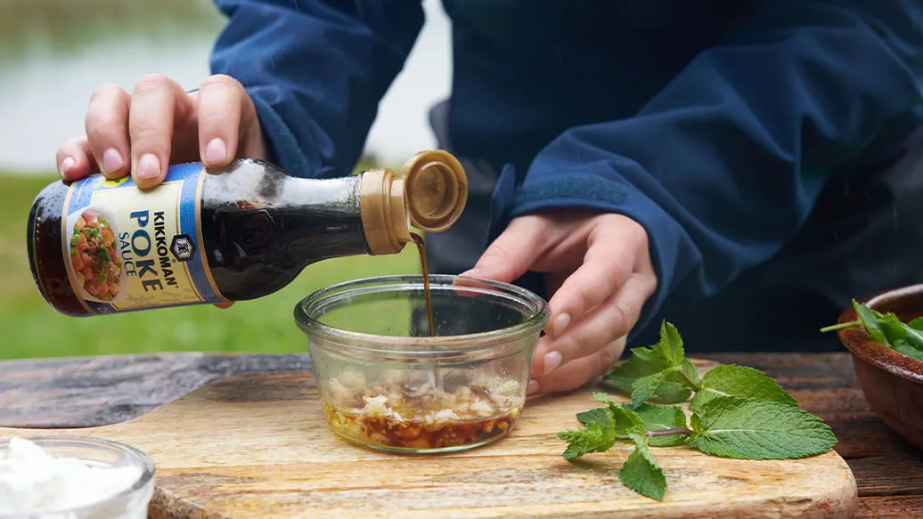 Ingwer und Knoblauch fein hacken, dann mit Kikkoman Poke Sauce und Honig zu einem Dressing vermengen.