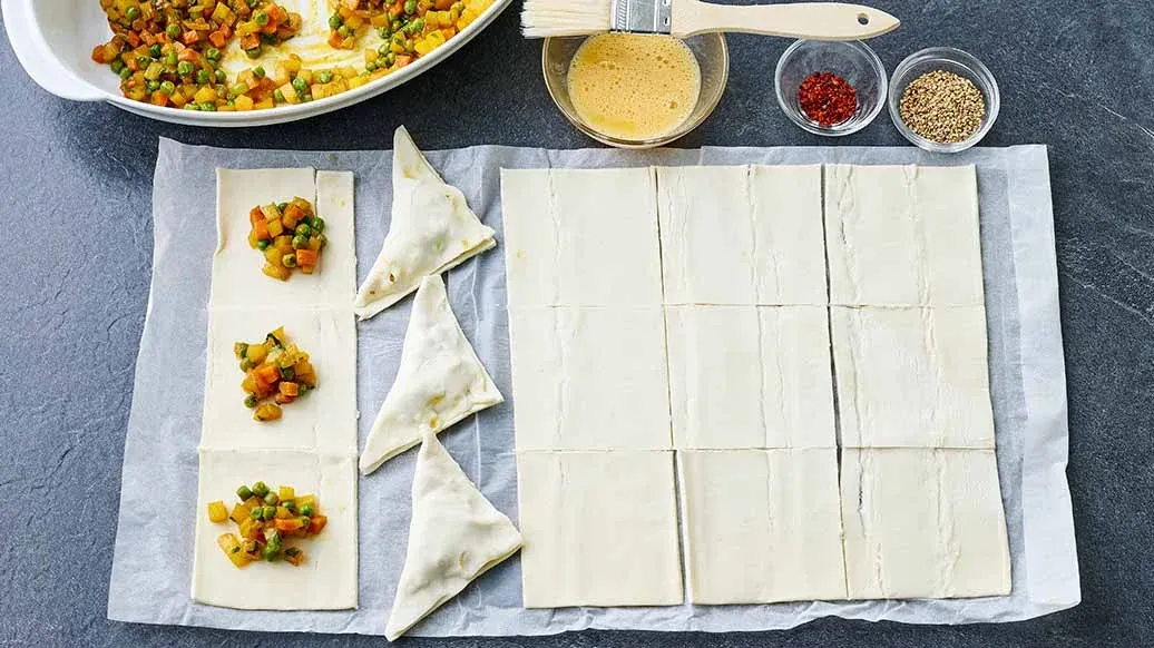 Backofen auf 200 °C vorheizen und ein Backblech mit Backpapier auslegen. Den Blätterteig entrollen und in 15 (je nach Teigsorte) gleich grosse Quadrate schneiden. Ca. 1 kleinen TL der Füllung in die Mitte jedes Quadrats setzen und den Teig zu einem Dreieck falten. Alternativ: 4 Kreise à ca. 12 cm Ø ausschneiden und diese halbieren. Den restlichen Teig zu 2 weiteren Kreisen zusammenlegen und ebenfalls halbieren. Die Teighälften zu „Tüten“ formen, ca. 1 kleinen TL Füllung hineingeben und den oberen Rand gut verschliessen. Die Samosas auf dem Backblech verteilen. Eigelb verquirlen, Samosas damit bestreichen, mit Sesam und Chiliflocken bestreuen und im vorgeheizten Backofen ca. 20 Minuten goldbraun backen. Die Samosas schmecken heiss oder kalt gleichermassen lecker.