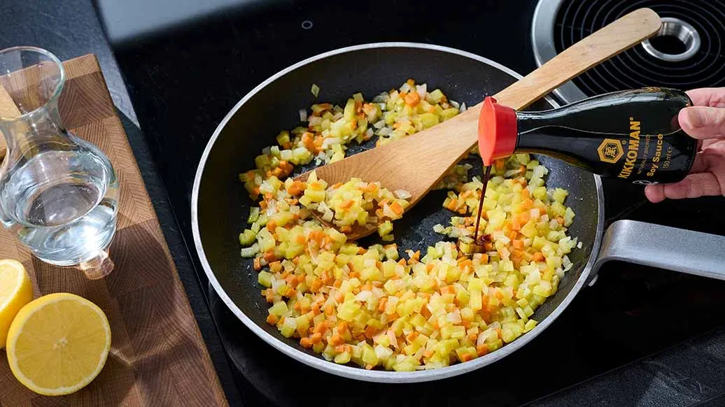 Kartoffeln und Karotte schälen, waschen, mit der Zwiebel in kleine Würfel schneiden und in erhitztem Öl anbraten. Mit Kikkoman Sojasauce, Zitronensaft und ca. 3 EL Wasser ablöschen. Offen ca. 10 Minuten köcheln lassen, dabei regelmässig umrühren.