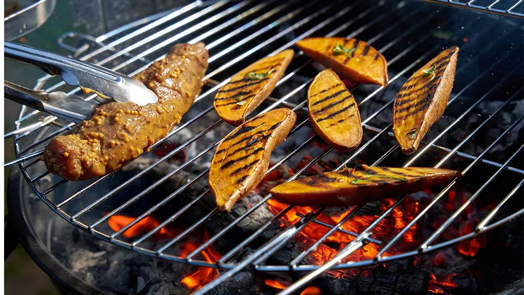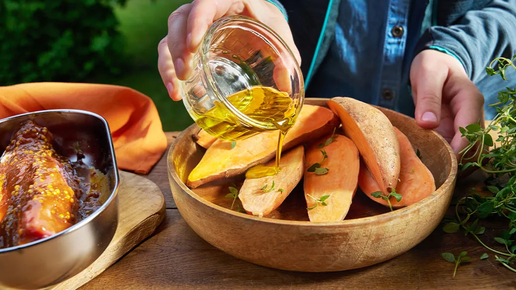 Süsskartoffeln waschen und halbieren. Mit Olivenöl beträufeln, Thymian hinzufügen und auf dem Grill oder in der Grillpfanne ca. 30 Minuten grillieren, bis sie weich sind.