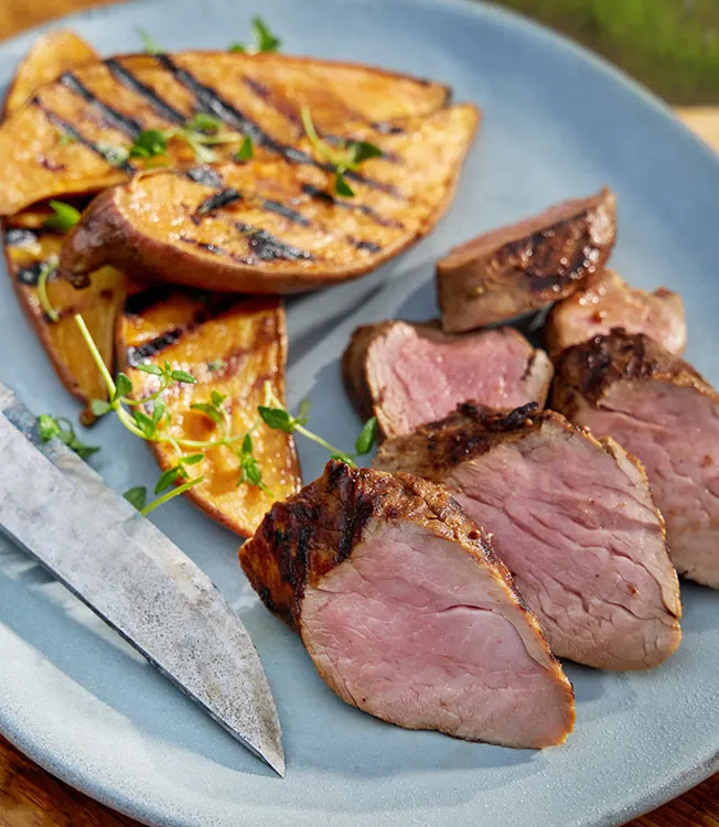 Das Schweinsfilet von allen Seiten etwa 12–15 Minuten auf dem Grill oder in der Grillpfanne garen. Das Fleisch vor dem Aufschneiden ca. 3 Minuten ruhen lassen. Mit den Süsskartoffeln und der aufbewahrten Marinade als Sauce servieren.