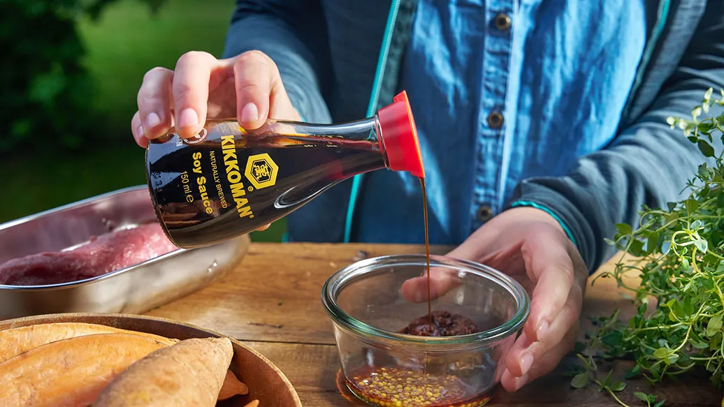 Saftiges Schweinsfilet, mariniert mit Senf, Misopaste und Kikkoman Sojasauce, serviert mit gerösteten Süsskartoffeln und Thymian.