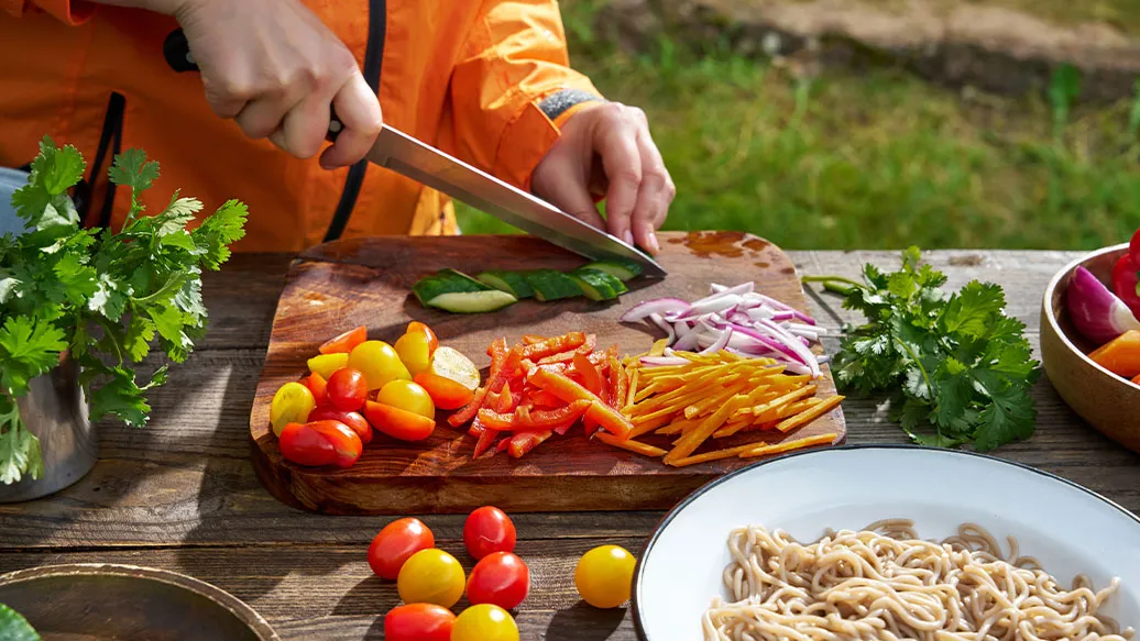 Soba-Nudeln gemäss Packungsanweisung garen, unter kaltem Wasser abspülen und abtropfen lassen. Karotten schälen und zusammen mit Gurken und Peperoni in ca. 5 cm lange, dünne Streifen schneiden. Zwiebel in dünne Spalten schneiden.