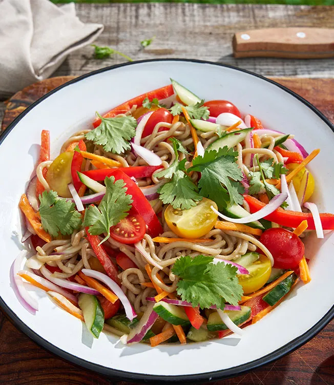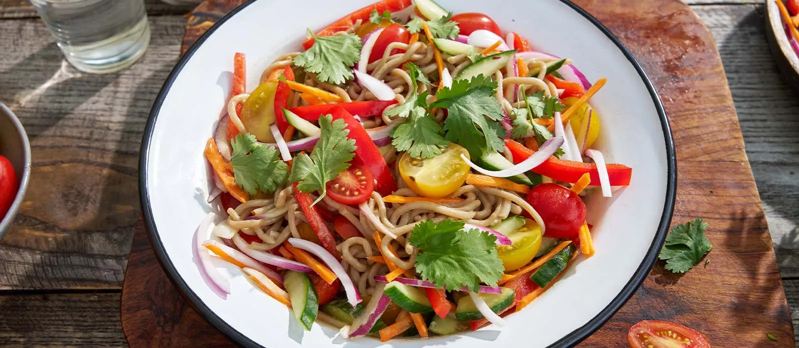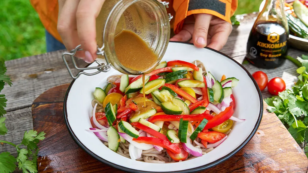 Soba-Nudeln mit knackigem Gemüse und einem aromatischen Dressing aus Kikkoman Sojasauce und Tahini – ein leichter und erfrischender Salat, ideal als Mittagessen.