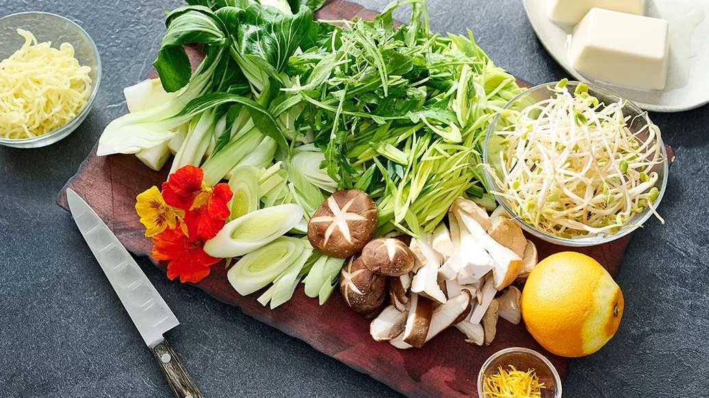 200 g Pilze (z. B. Enoki, Austernpilze, Shiitake) – 200 g Rucola – 150 g Sojasprossen – 2 Stangen Lauch – 2 Pak Choi – 300 g Tofu