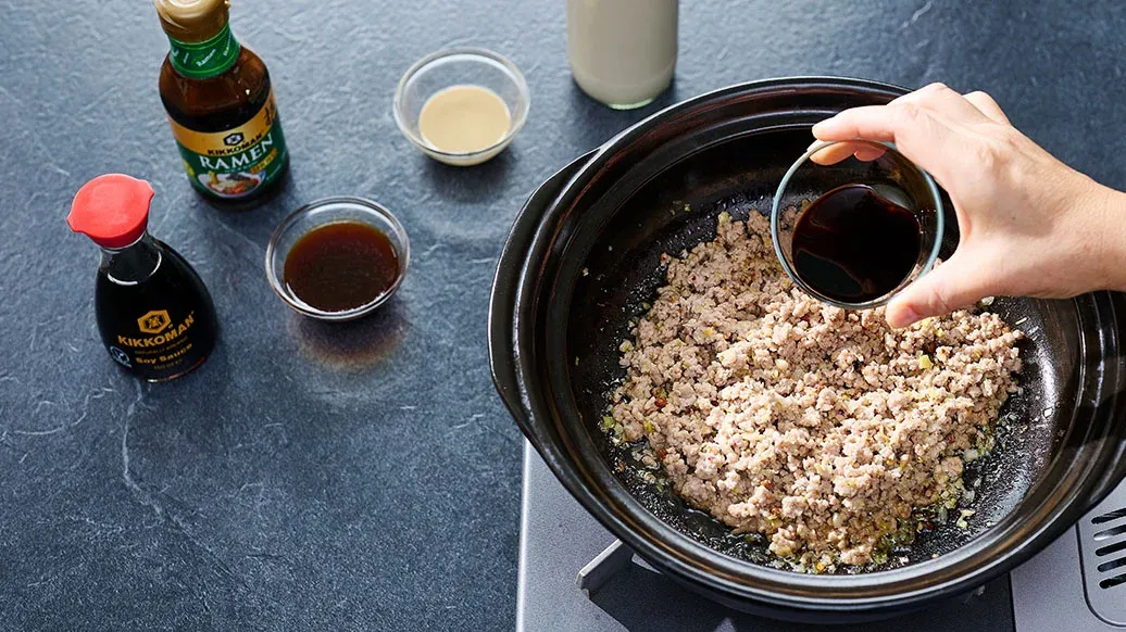 2 EL Kikkoman geröstetes Sesamöl – 1 EL Knoblauch, gehackt – 1 EL Ingwer, gehackt – Lauch, gehackt (weisser Teil aus Schritt 1) – 1 TL Sichuan-Pfeffer, gemahlen – ½ TL getrocknete Chilischoten, zerkleinert – 300 g Hackfleisch, beliebige Sorte – 2 EL Tahini – 3 EL Kikkoman Konzentrierte Ramen Suppenbasis - Shoyu (Sojasauce) Geschmack – 2 EL Kikkoman natürlich gebraute Sojasauce – 2 TL Salz – 1 l ungesüsste Sojamilch