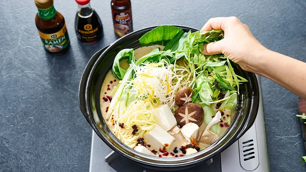 Eine wärmende Bouillon mit der prickelnden Schärfe von Sichuan-Pfeffer und Chili, angereichert mit Tahini und Sojamilch für mehr Cremigkeit. Gewürzt mit Kikkoman Sojasauce und Kikkoman Sesamöl und am Tisch mit Essig oder Chili-Öl verfeinert.