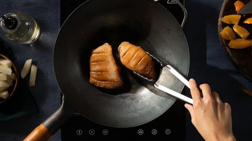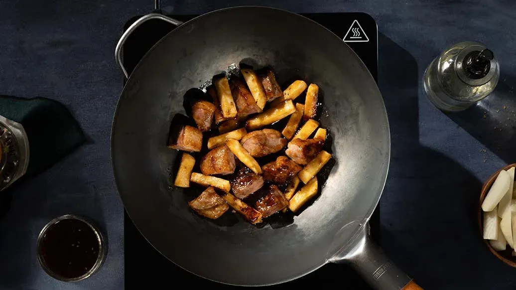 Die Haut der Entenbrust mit einem scharfen Messer ein paarmal längs und im Abstand von etwa 5 mm quer einritzen. Mit einem Schuss Öl in einem Wok bei mittlerer Hitze 12 Minuten auf der Hautseite goldbraun und knusprig braten, dann wenden und 3 Minuten fertig braten. Aus dem Wok nehmen (das Entenfett im Wok aufheben), kurz ruhen lassen.