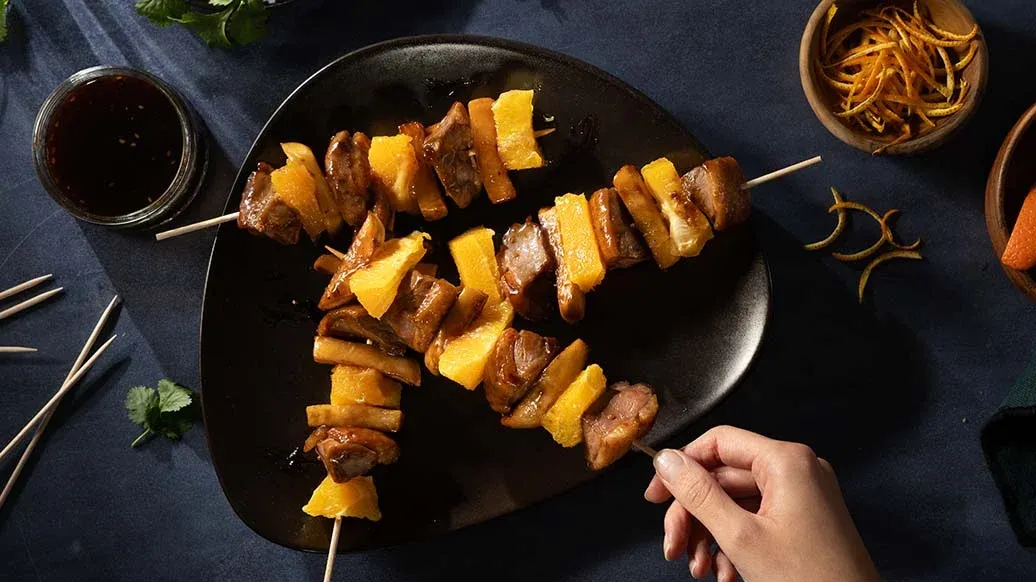 Knusprig-saftiges Fingerfood für Partys oder als asiatisch-französischer Auftakt im Menü. Krosse Entenbrust und knackiger Daikon-Rettich werden mit Kikkoman Teriyaki Sauce Knoblauch glasiert und mit Orange zu feinen Spiesschen kombiniert.