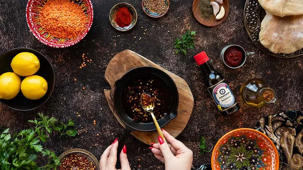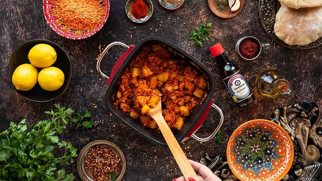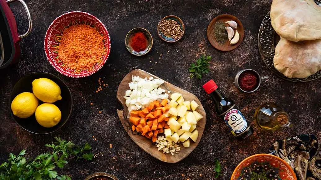 Eine wohltuende Suppe aus roten Linsen, Karotten und Kartoffeln, aromatisiert mit Knoblauch, Gewürzen und Tomatenpüree. Kikkoman Sojasauce sorgt für viel Umami, während Minze, Petersilie, Chili und Zitrone lebendige Frische liefern.