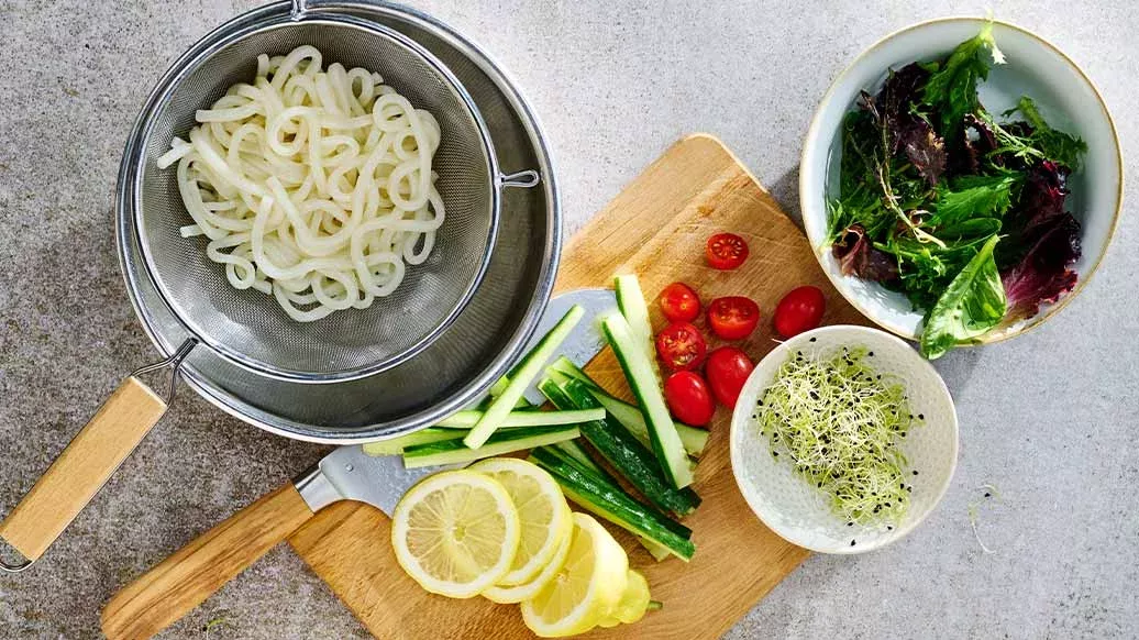 2 Portionen Udon-Nudeln – 2 EL Sprossen – 2 Becher Babyspinat (oder 8 Kopfsalatblätter) – 80 g Salatgurke – 6 Cherrytomaten – 60 g Karotte, längs in dünne Streifen geschnitten – 4 Scheiben Zitrone (oder Limette)
