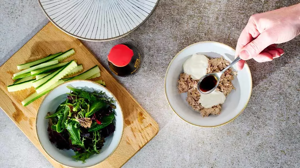 Thunfisch mit Mayonnaise und Kikkoman Sojasauce mischen.
