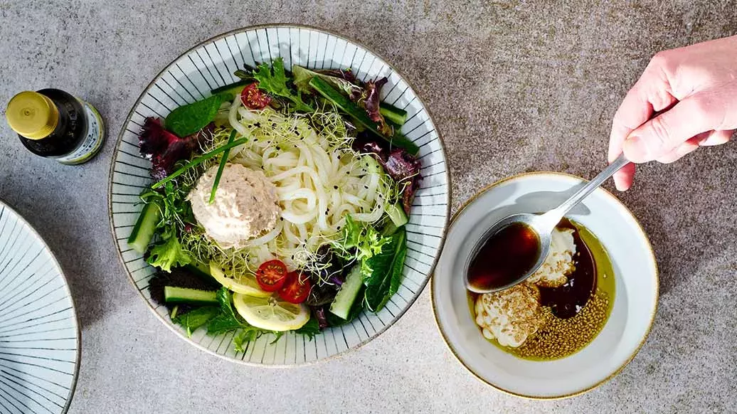Die Salatblätter in einen tiefen Teller geben, dann die Udon-Nudeln und das Gemüse hinzufügen. Mit Thunfisch belegen und Dressing darübergiessen.