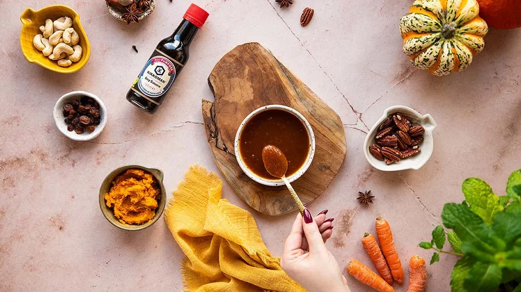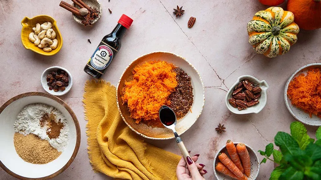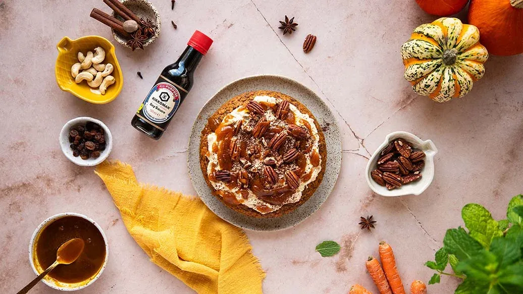 Ein veganer Karottenkuchen mit cremiger Cashewglasur, knackigen Pekannüssen und einem Kürbisgewürzsirup mit Kikkoman Sojasauce – ausgewogen und voller sanfter Umami-Tiefe.