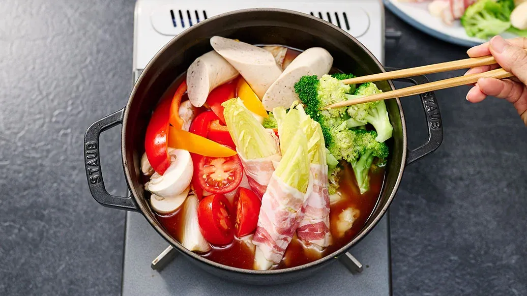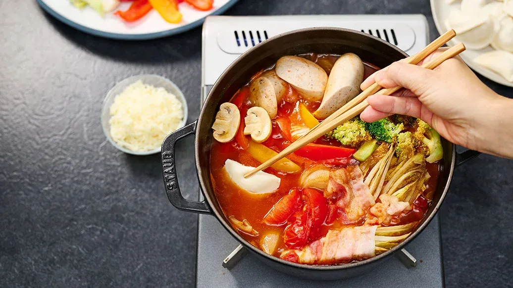 Dieser Eintopf aus gängigen europäischen Zutaten besticht durch die Säure der Tomaten und die Schärfe von Kikkoman Kimchi Chilisauce. Räucherspeck, Würstchen und Käse sorgen für viel Umami. Schnell am Tisch zubereitet und ideal zum Teilen.