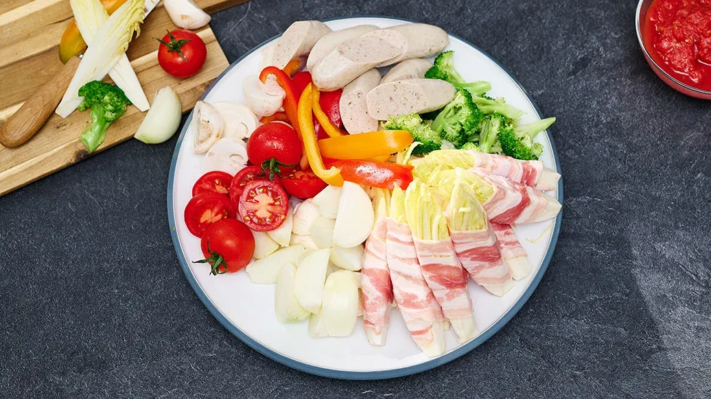 Chicorée längs vierteln und jedes Stück mit einer Speckscheibe umwickeln. Broccoli in mundgerechte Röschen zerteilen. Zwiebel und Tomaten in je 8 Spalten, Peperoni längs in Streifen schneiden. Pilze putzen, grössere Pilze (Champignons oder Austernpilze) halbieren und Enoki-Pilze in Büschel teilen. Die Würstchen halbieren.