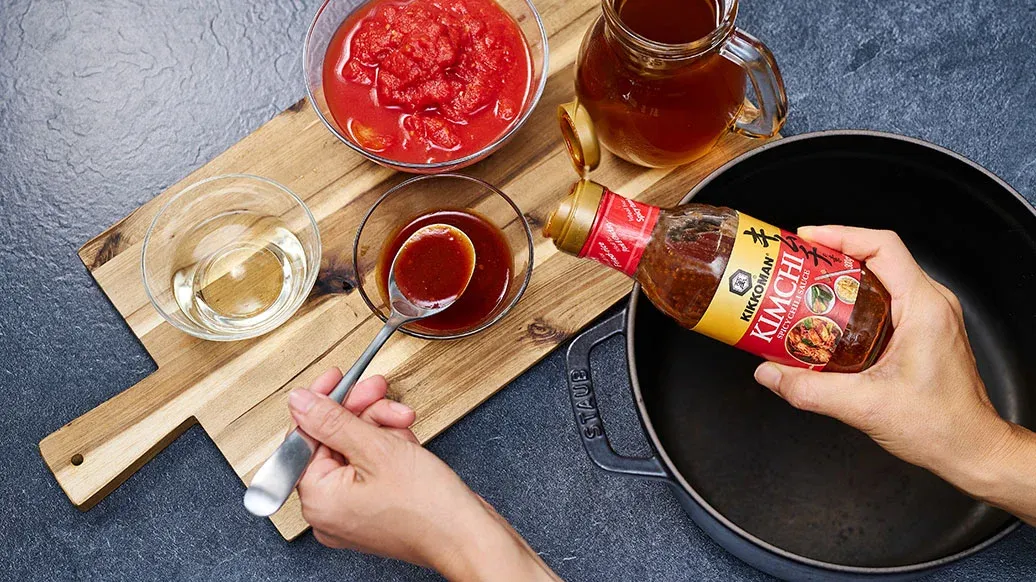500 ml Hühnerbouillon – 400 g gehackte Tomaten aus der Dose – 50 ml Weisswein – 4 EL Kikkoman scharfe Chilisauce für Kimchi