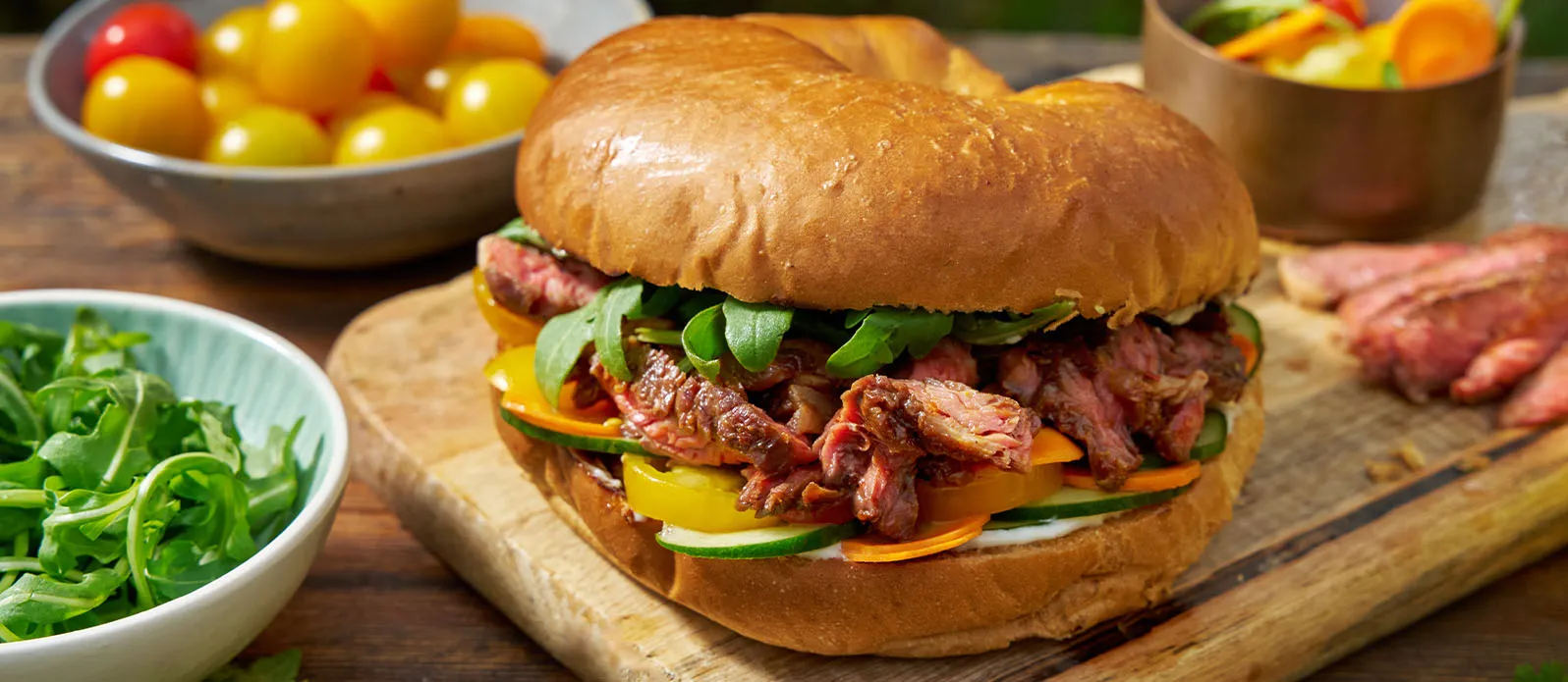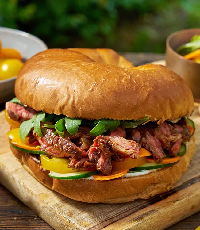 Brötchen halbieren und leicht anrösten. Die unteren Hälften mit Mayonnaise bestreichen, dann mit den Rindfleischscheiben, Rucola, den Kirschtomaten sowie den Gurken- und Karottenscheiben belegen. Die obere Brötchenhälfte aufsetzen und Sandwiches warm oder kalt servieren.