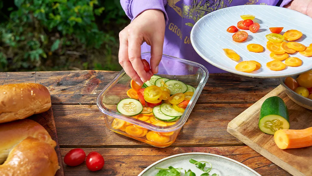80 g Salatgurken – 80 g Karotten – 20 ml Reisessig – 1 EL Honig – 80 g Cherrytomaten