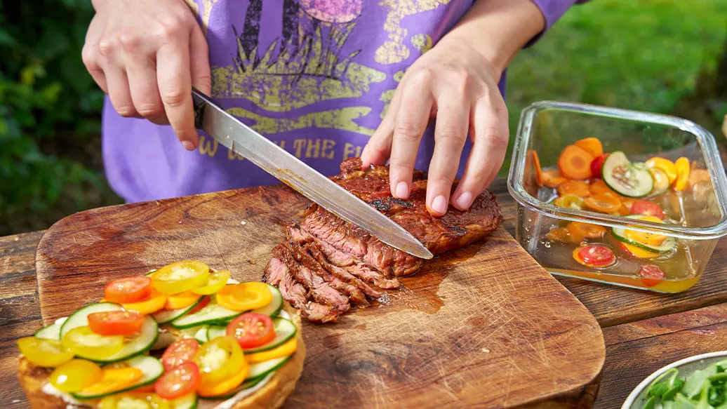 Steak ca. 15 Minuten in Kikkoman Kimchi Chilisauce marinieren, dann 3–4 Minuten auf beiden Seiten anbraten oder grillieren. Das Fleisch in dünne Scheiben schneiden.