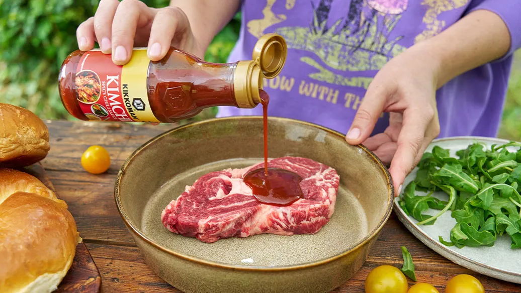 Saftiges, in Kikkoman Kimchi Chilisauce mariniertes Rindfleisch, serviert in einem Brioche-Brötchen mit knackiger Salatgurke, Tomaten und Rucola.